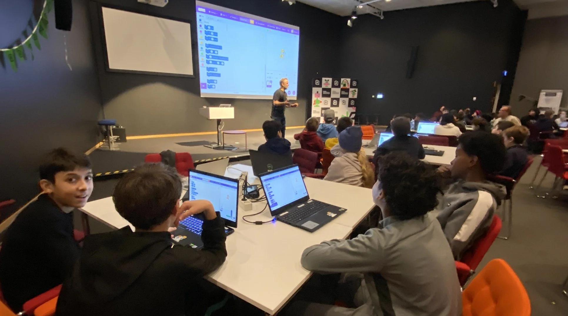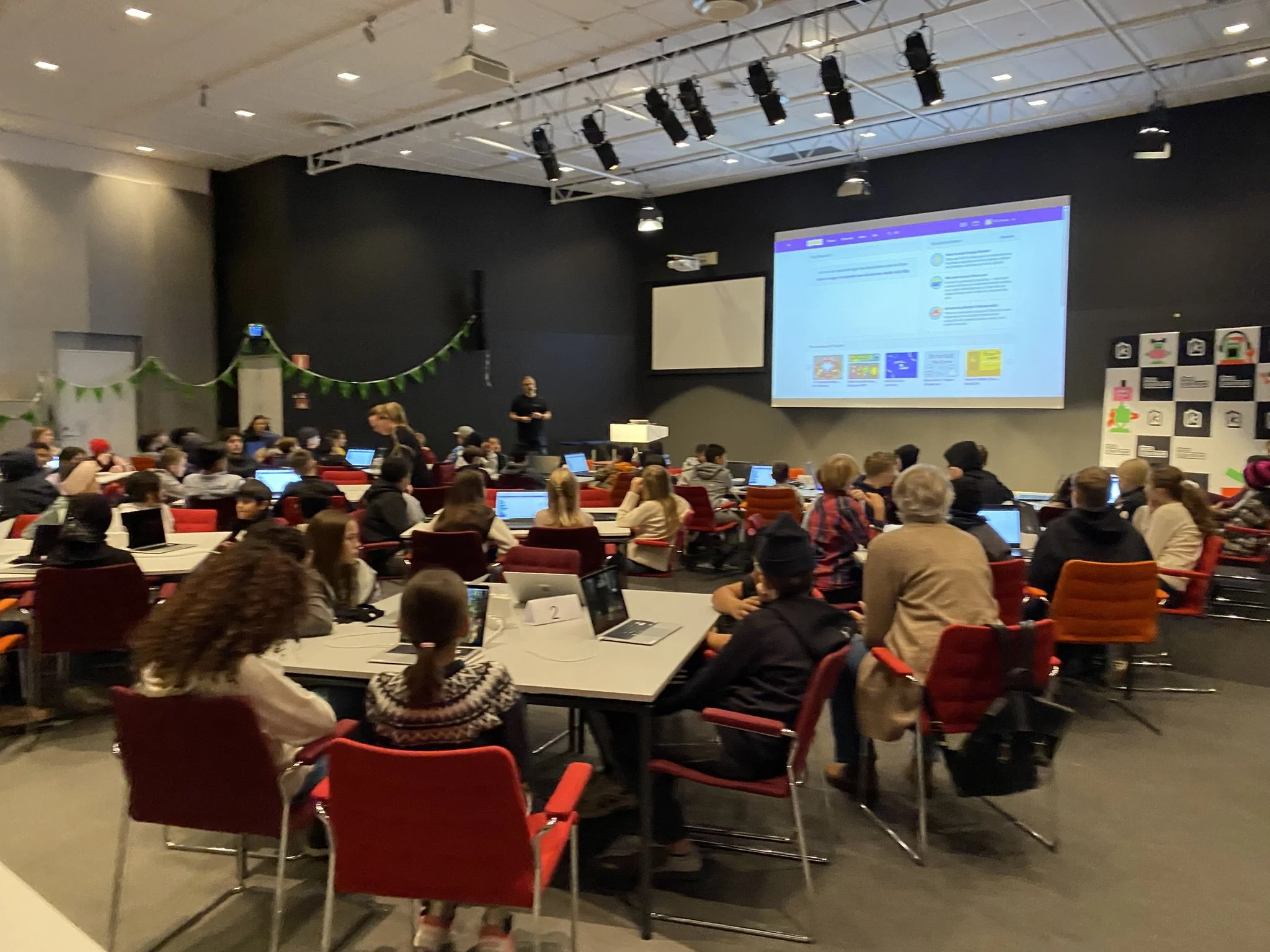 I måndags och tisdags 17 och 18 november, samlades sammanlagt 300 elever för att programmera, skapa spel och ha roligt med teknik! Det blev två fantastiska kodkalas-dagar på Ericssons huvudkontor i Kista. Vi hade ett högt tempo och eleverna var otroligt duktiga. Med oss på kodkalaset hade vi fantastiska volontärer från SSIS gymnasiet i Kista (Stockholm Science and Innovation School) som hjälpte eleverna när det kört fast eller behövde lite pepp!